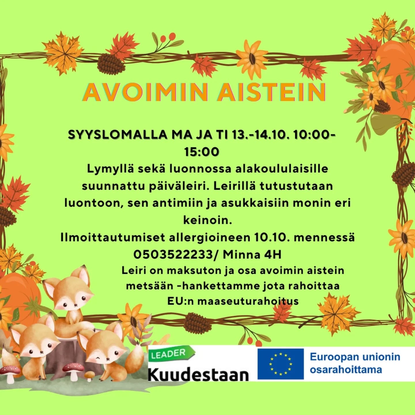 Leiri on maksuton ja osa Avoimin aistein metsään -hanketta, jota rahoittaa EU:n maaseuturahoitus.