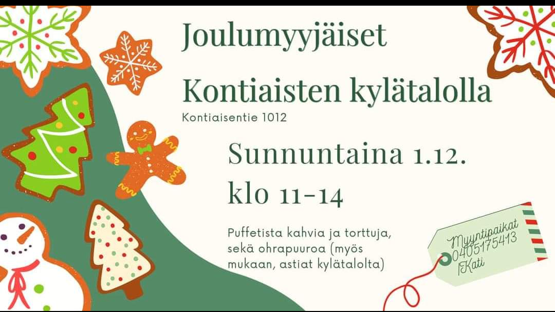 Perinteiset joulumyyjäiset, kylätalon kahviosta torttukahvit, vanhan ajan ohraryynipuuroa ja soppaa (voi ostaa myös mukaan, astiat kylätalolta).