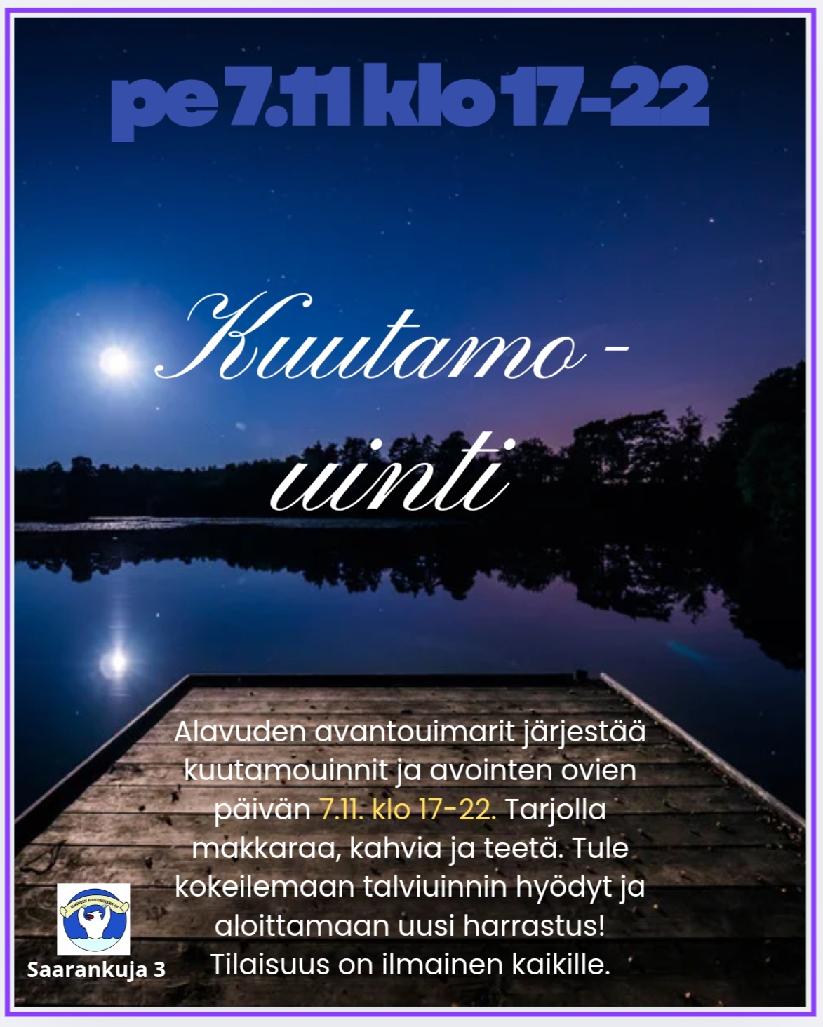 Paikkana avantouimareiden avanto Alavuden Keskustassa Harrin uimarannalla. Osoite Saarankuja 3, Alavus.