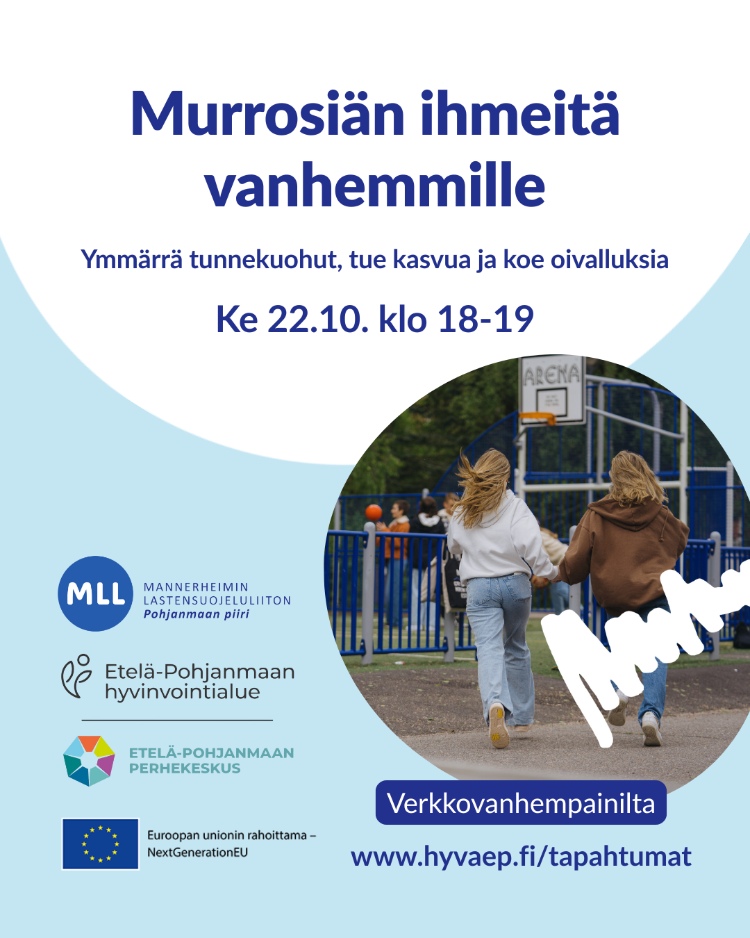 Tervetuloa mukaan verkkovanhempainiltaan, jossa jaamme ajatuksia, kokemuksia ja käytännön vinkkejä murrosiän ymmärtämiseen ja yhdessä kasvamiseen.